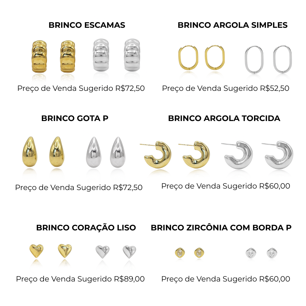 Composto por 12 peças cuidadosamente selecionadas, incluindo brincos em banho de ouro 18k e prata, como argolas, gotas e peças com zircônia.